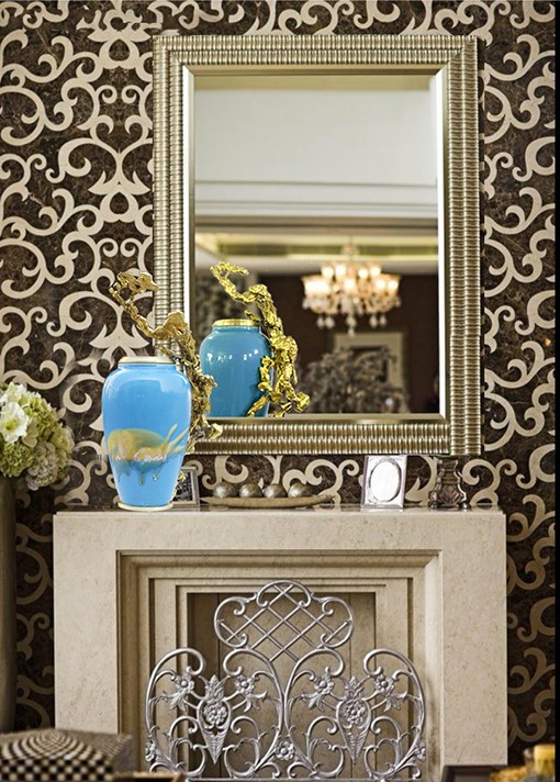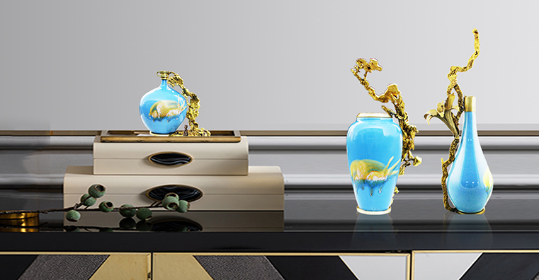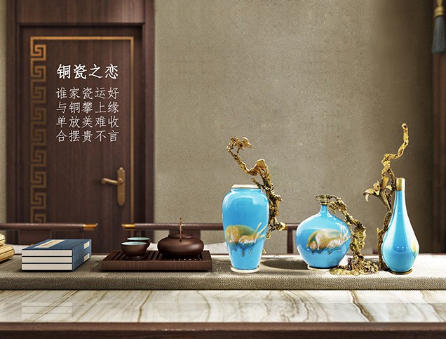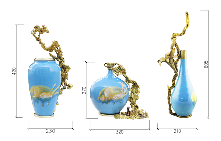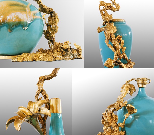 首先給彩瓷加了一個銅底座、銅沿口,然后把熔化后的銅水倒進沙里,形成不同自然形狀后再與彩瓷底座和沿口相連,效果出人意料的好,厚重與輕脆相融,古樸與現(xiàn)代結(jié)合,也不知是瓷攀上了銅,還是銅纏上了瓷。相得益彰,妙不可言。